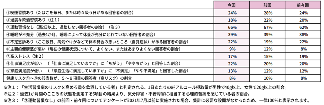 | プレゼンティーイズム(労働生産性の低下率)(0%に近い程良い) | -25% | -24% | -21% | -20% | -23% | |